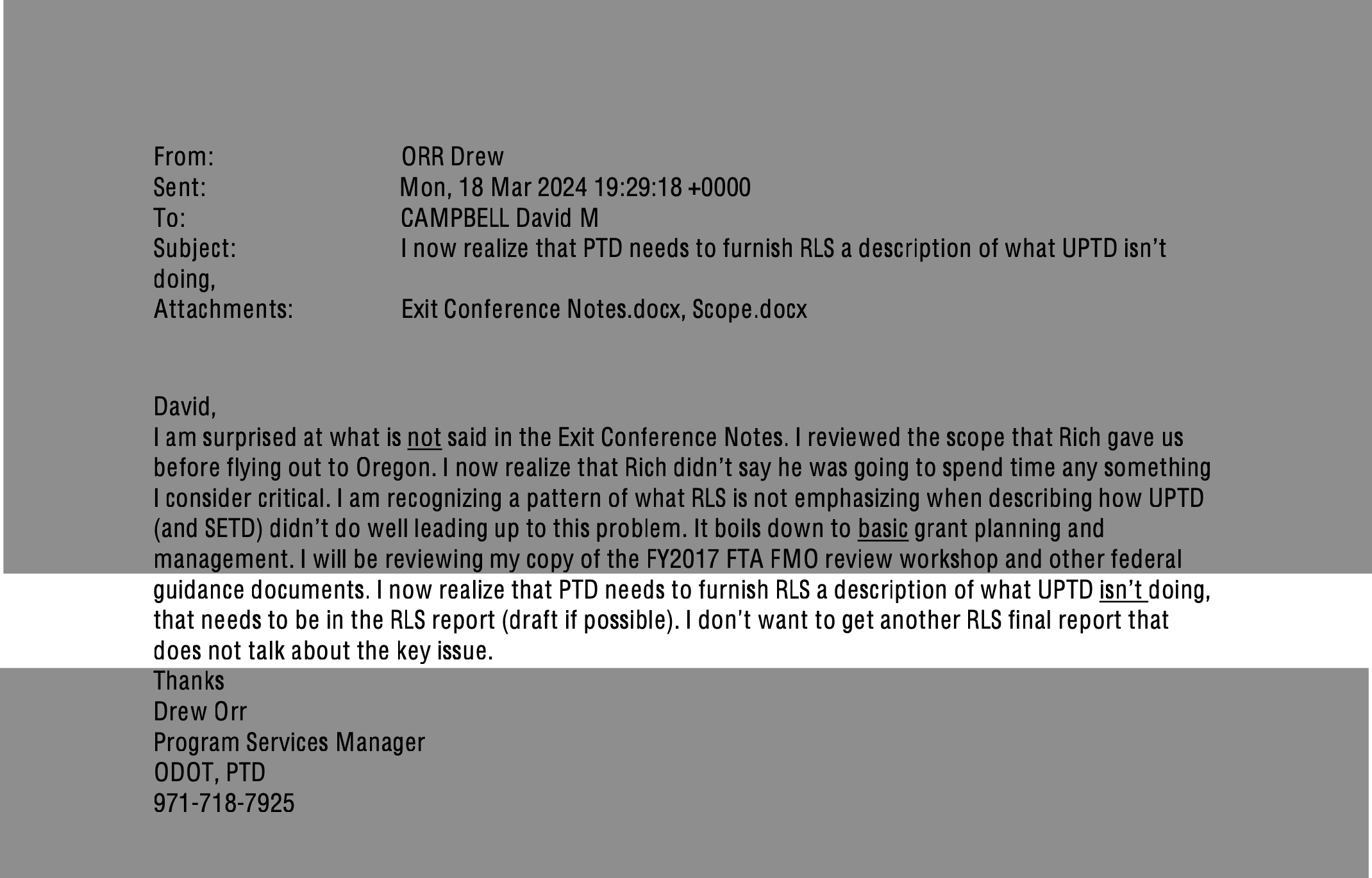 “I now realize that PTD needs to furnish RLS a description of what UPTD isn’t doing. I don’t want to get another RLS final report that does not talk about the key issue.”