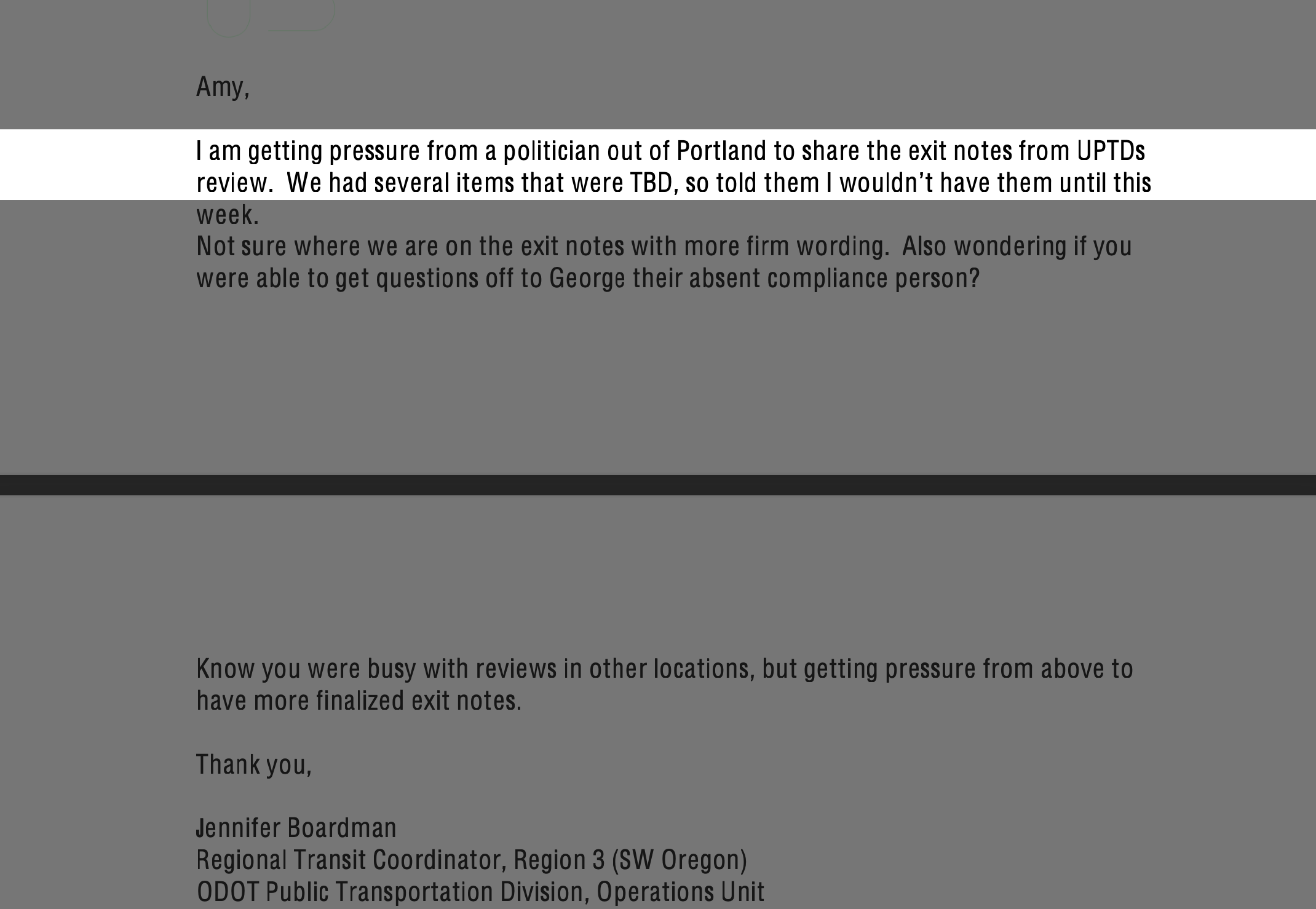 “I am getting pressure from a politician out of Portland to share the exit notes from UPTD’s review,” ODOT regional transit coordinator Jennifer Boardman wrote in an internal email.