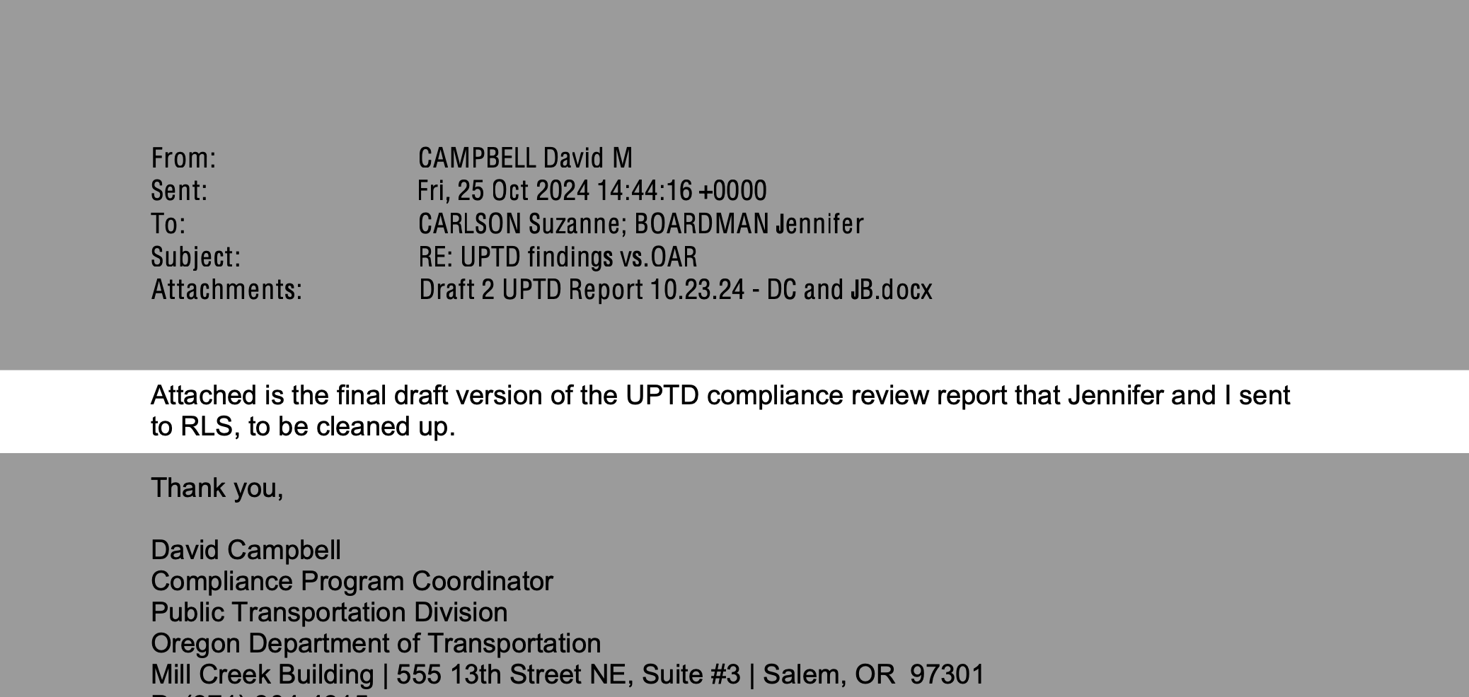 In an October 2024 email titled “UPTD findings vs OAR,” ODOT compliance manager David Campbell wrote: